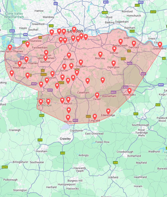 We cover Croydon and a wide 25-mile radius, including Sutton, Purley, Coulsdon, Banstead, Epsom, Bromley, and surrounding South London areas.